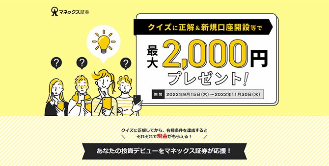 クイズ正解&新規口座開設等で最大2,000円もらえる